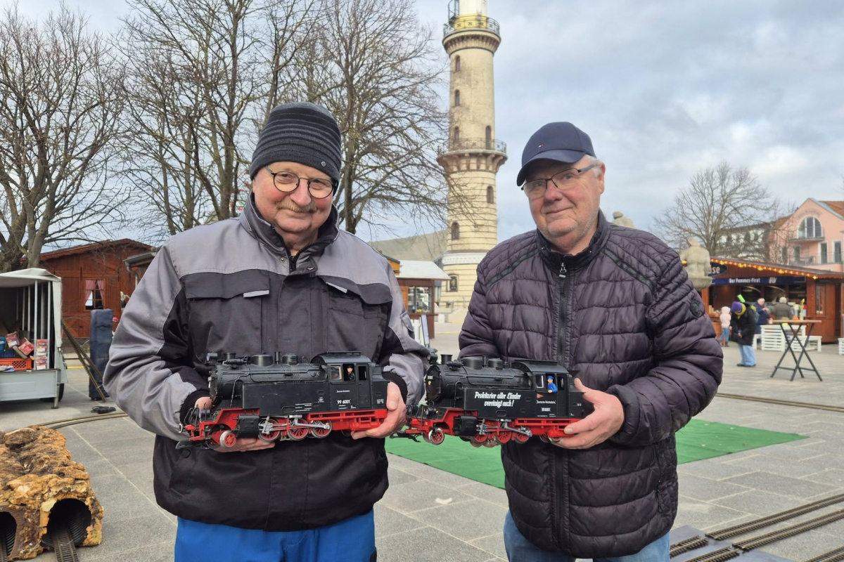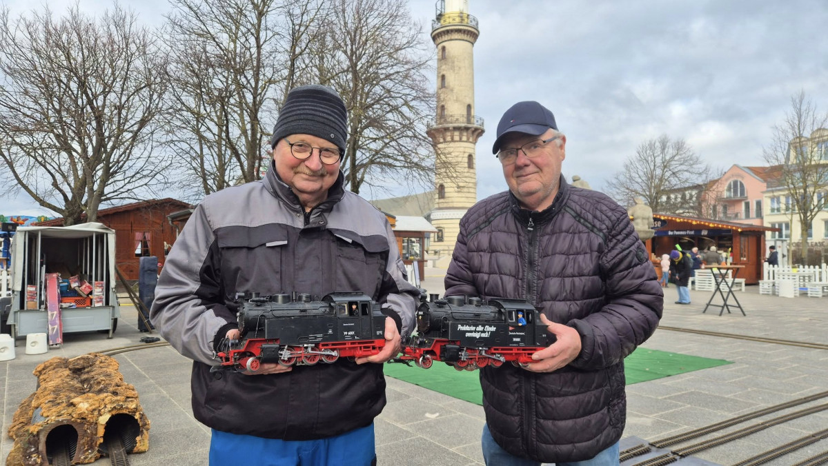Das zweite Wochenende des Wintervergnügens startete mit einem besonderen Highlight für Technikliebhaber: Eisenbahnfan Wolfgang Kröger präsentierte einen Ausschnitt seiner beeindruckenden Gartenbahnanlage. Unterstützt von seinem langjährigen Freund Reinhard Hübl zog die Bahn Groß und Klein in ihren Bann. „Die Faszination für Modelleisenbahnen lässt einen nie los“, sagte Kröger, der sich bereits seit seinem sechsten Lebensjahr diesem Hobby widmet – seit 27 Jahren als „Gartenbahner“. Während auf seiner privaten Anlage in einem Rostocker Kleingarten insgesamt 200 Meter Gleis mit liebevoll gestalteten Gebäuden und Tunneln verbaut sind, konnten die Besucher in Warnemünde zumindest einen kleinen Einblick in die Welt der Gartenbahner erhalten.
