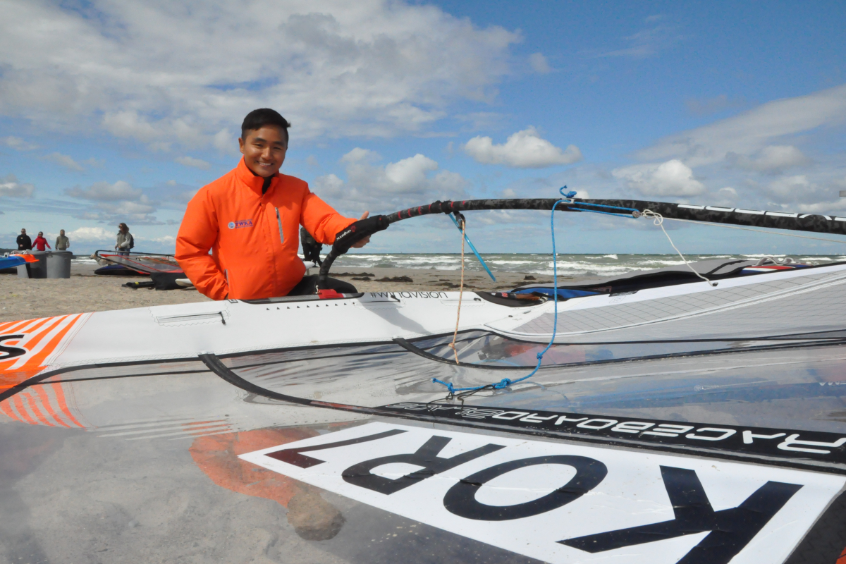 Für Han Kim bedeutet die WM-Teilnahme gleich zwei Premieren: Es ist seine erste internationale Regatta und gleichzeitig sein erster Europaaufenthalt. „Ich habe erst vor zwei Jahren mit dem Windsurfen begonnen, war aber bereits Champion in Korea. Hier sind die Bedingungen für mich hart, weil ich es gewohnt bin, bei wenig Wind und kaum Welle zu surfen. Ich bin hier gefühlt der kleinste Fahrer mit dem größten Segel“, erklärt der 28-Jährige. Tongyeong lautet der Name seines Heimatwindsurfreviers an der Südküste Südkoreas. Von seinem Wohnsitz in der südkoreanischen Hauptstadt Seoul ist der Spot etliche Stunden Autofahrt entfernt. An der Raceboard-Klasse gefällt Kim die Tatsache, dass dabei nicht ausschließlich physische Kraft, sondern viel taktisches Geschick gefragt ist. „Alter spielt beim Raceboarden deshalb kaum eine Rolle. Auch ältere Fahrer können problemlos gegen junge gewinnen. Außerdem brauchen wir zum Windsurfen nur wenig Wind und können so sehr häufig trainieren“, sagt der Koreaner, der beruflich in der Finanzbranche zu Hause ist.